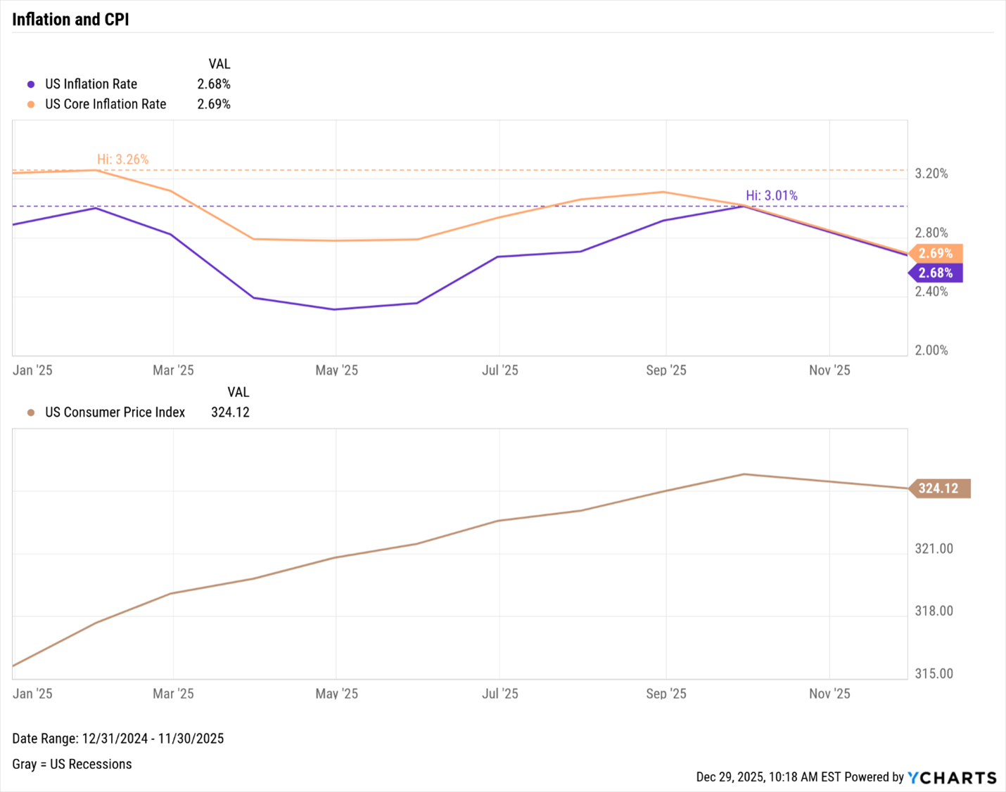 Inflation throughout 2025 persisted above the Fed’s 2% target, even as headline figures began to cool slightly. Consumers continued to face pressure from rising prices on essential goods such as bananas, ground beef, and coffee, which saw some of the steepest increases of the year. The Trump administration responded by implementing targeted tariff exemptions aimed at mitigating these price increases. The inflation picture was further complicated by a government shutdown in the fall, which disrupted the collection of Consumer Price Index (CPI) data. As a result, there was no CPI reading for October, and the November core CPI figure came in at 2.6%, heavily influenced by Black Friday discounts. Economists cautioned that this data likely understated the true level of inflation.