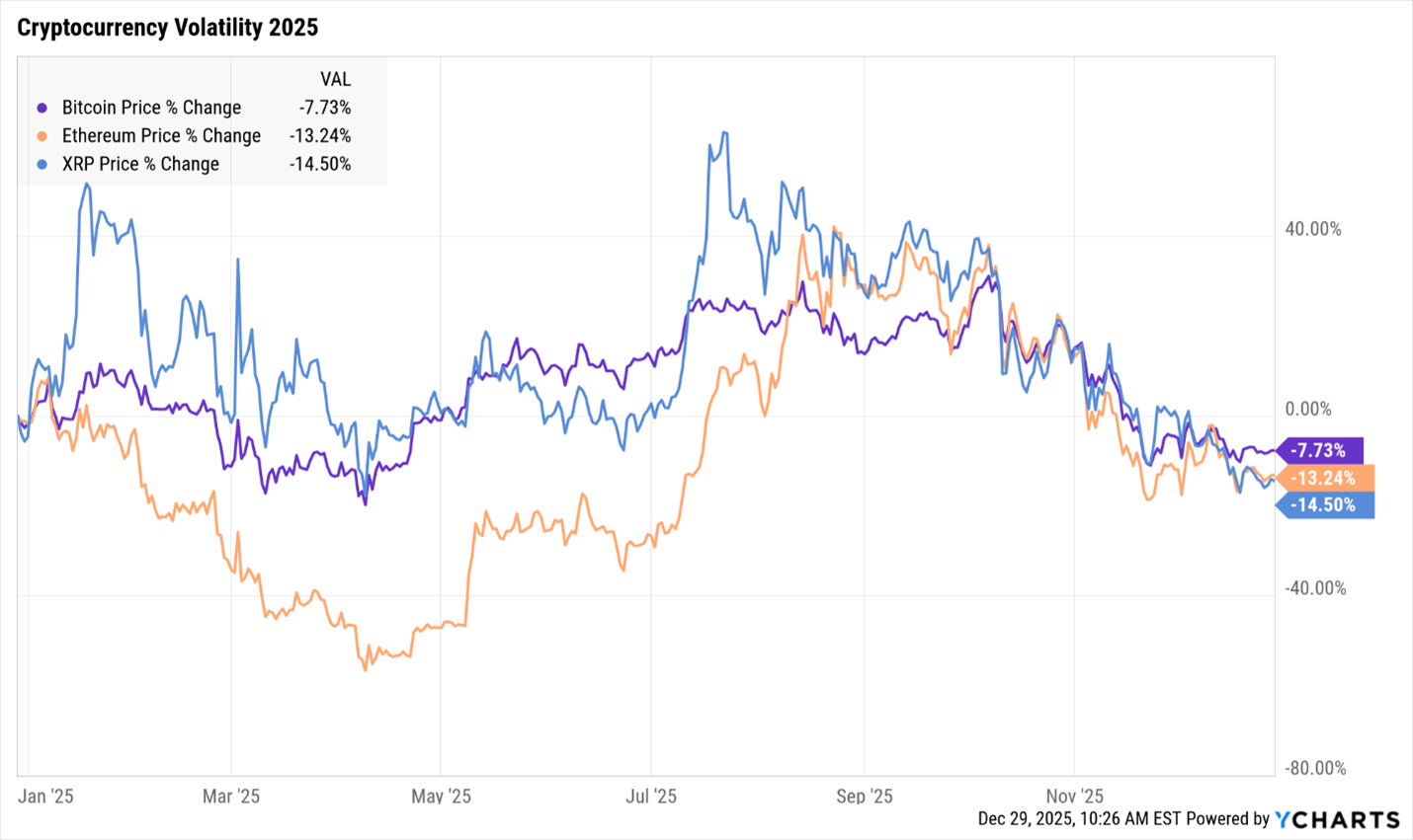 Cryptocurrencies saw a major resurgence in 2025, fueled by improved liquidity, greater institutional involvement, and a more supportive regulatory environment. Following a subdued first quarter, digital assets accelerated in the summer and fall, with Bitcoin briefly surpassing $126,000. However, momentum faded toward year-end, and major cryptocurrencies—including Bitcoin—retreated from their highs, closing the year on a weaker note.