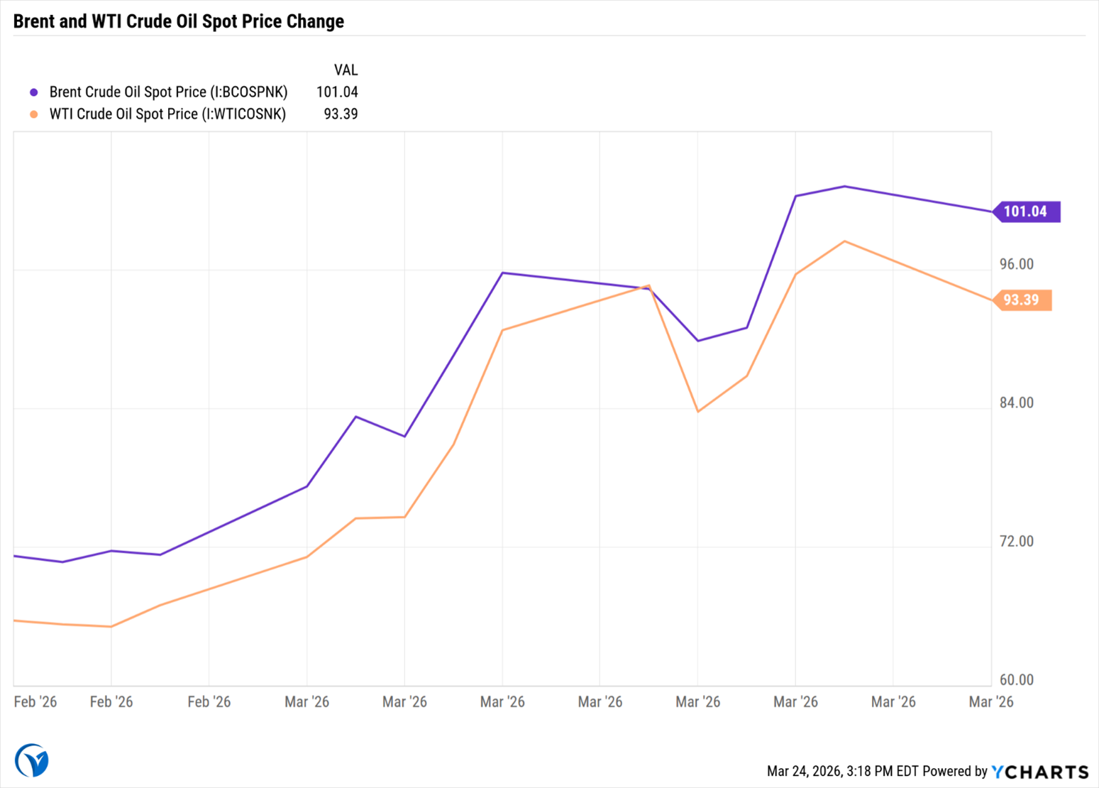 Brent crude surged past $100/bbl to a high of $112/bbl on March 12, up from approx. $70 before the conflict. U.S. gasoline prices climbed to $3.84 per gallon by March 18, compared with $2.98 before the late February strikes.